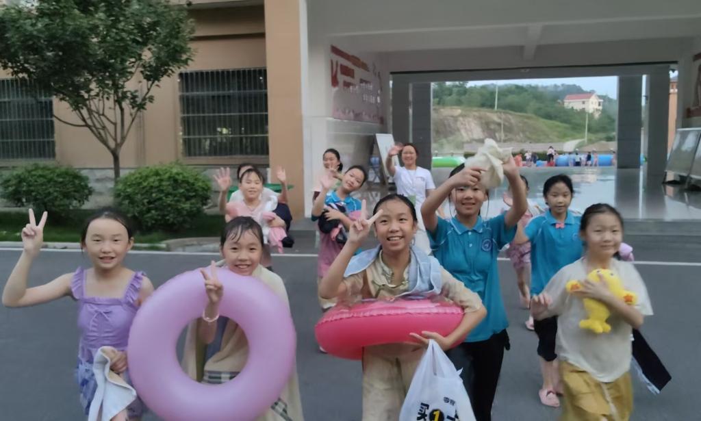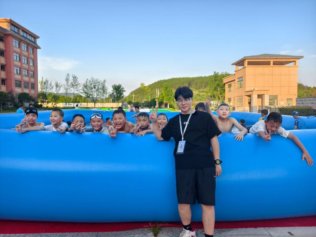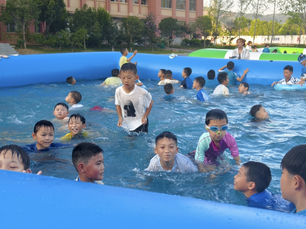 为从源头规避野外游泳风险,学校专门开设游泳培训课。支教团队成员始终全程陪伴,为学生安全保驾护航。“每节课前,成员们都会逐一检查设施安全;课上紧盯每个孩子的状态,全程贴身看护,确保孩子们既能在清凉中享受运动乐趣,又能系统掌握游泳技能。”支教老师杨老师介绍道。此外,课程还巧妙融入防溺水知识问答,通过趣味游戏形式加深记忆,让安全意识在学生心中生根发芽。