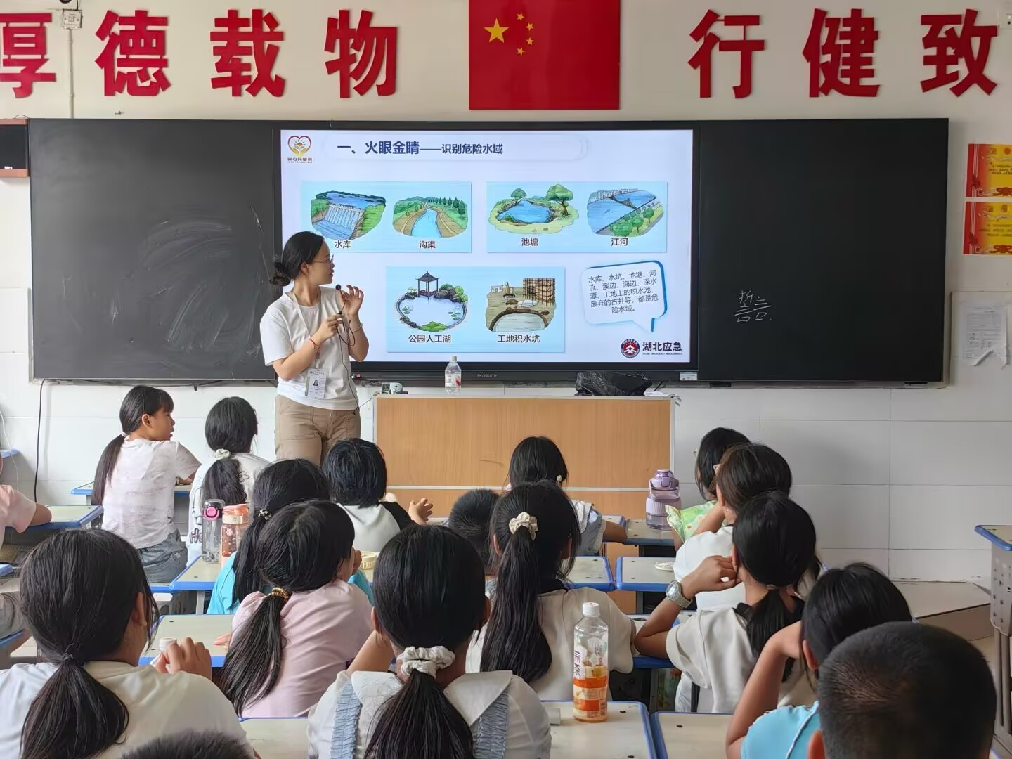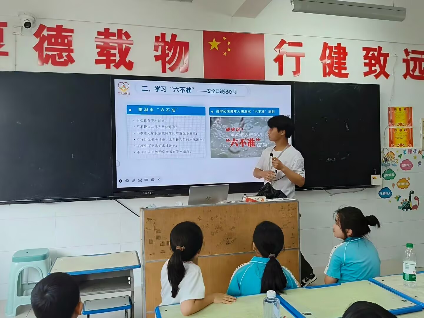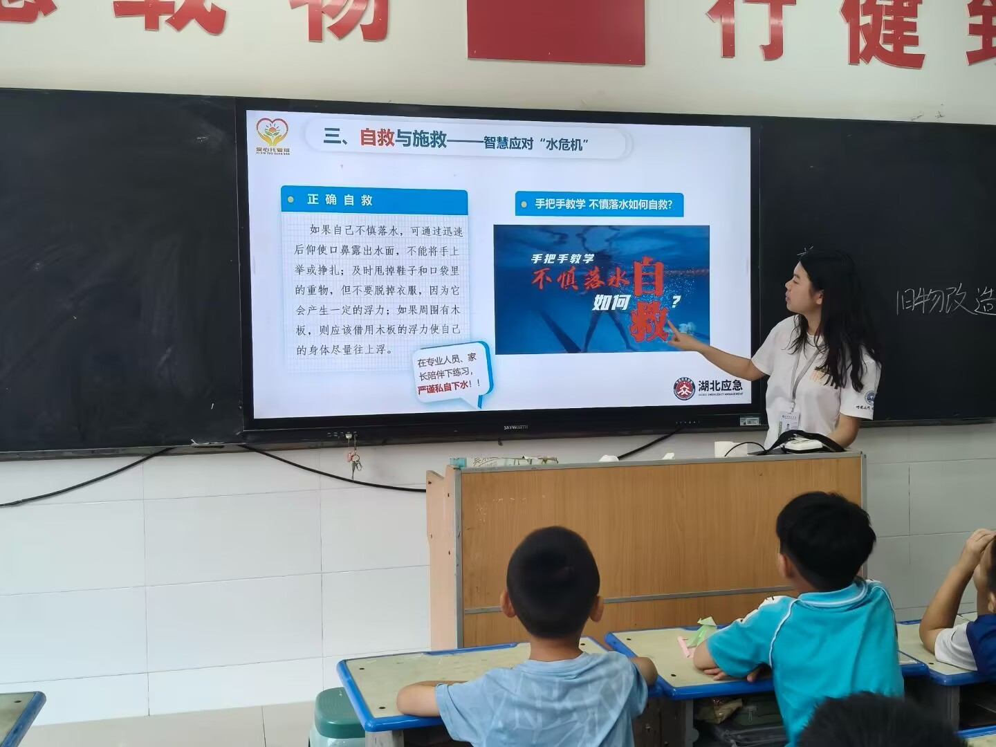 “同学们,发现有人溺水时,千万不能直接下水救人!”在广水市致远学校的教室里,励励晴川志愿服务团队的支教老师正通过动画演示与情景模拟,为小朋友们带来一堂生动直观的防溺水安全课。课堂上,老师们结合真实案例强调野外游泳的危险,并带领小朋友熟记“安全六不准”:不准私自下水游泳、不准擅自与他人结伴游泳等。支教老师还深入浅出地讲解游泳前的热身要点与水域危险识别方法;“若遇同伴落水,要第一时间呼救并迅速寻找救生工具,比如竹竿、漂浮物等……”学生们踊跃参与互动,在沉浸式模拟演练中体会到溺水的危险,更在亲身体验中将防溺水的意识刻进了心里。
