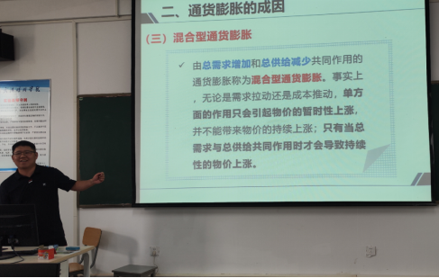 王秋田老师以通货膨胀的成因为磨课主题,讲解时融入了国内外经济形势,使学生能够清晰地看到通货膨胀成因在现实经济中的具体表现。唐姚毓老师在评价中指出,王老师的讲解条理清晰,对通货膨胀成因的分析十分透彻。她建议王老师在未来的教学中,可以加入更多时下热门的经济事件,让学生探讨这些事件背后的通货膨胀成因,以此提升学生将理论应用于实际问题分析的能力。顾铭慧老师也提出,在讲解通货膨胀成因时,应引导学生思考如何利用政策工具预防和处理由不同原因引起的通货膨胀,从而培养学生的政策分析和经济决策能力。
