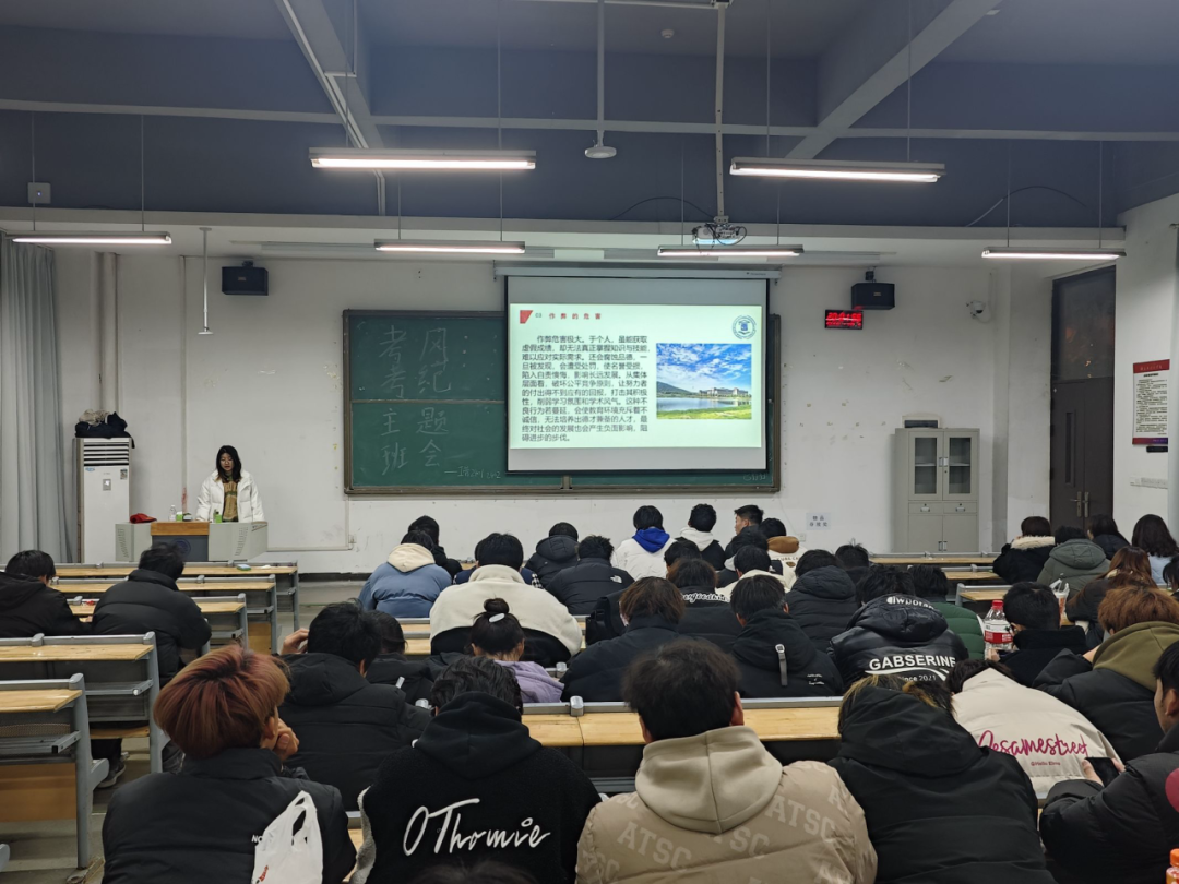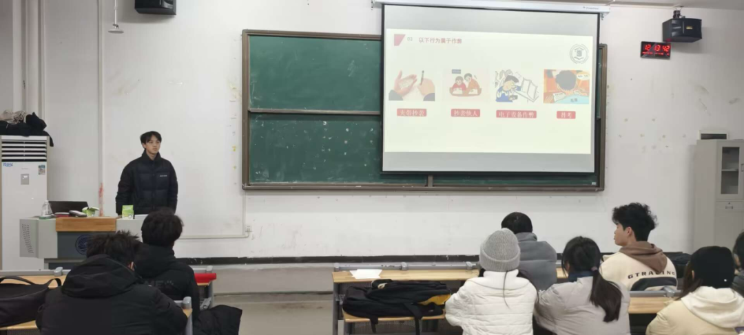 班助们重点介绍了作弊类型,如夹带抄袭、抄袭他人、利用电子设备作弊、替考等,并通过实际案例进行分析。深刻剖析了作弊行为对个人和集体的严重危害。于个人而言,作弊虽可能获取虚假成绩,但无法真正掌握知识技能,损害自身品德名誉,影响长远发展;从集体层面看,破坏公平竞争原则,打击努力学习同学的积极性,削弱学习氛围和学术风气,对教育环境和社会发展产生负面影响。