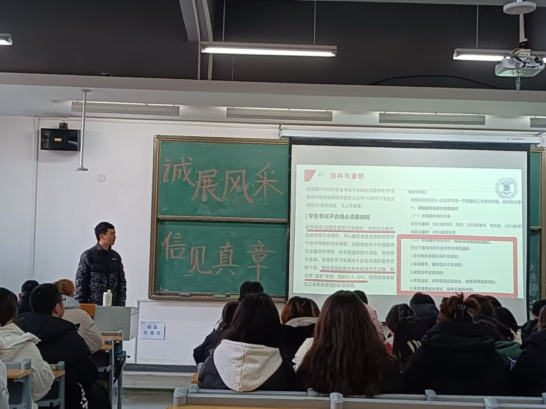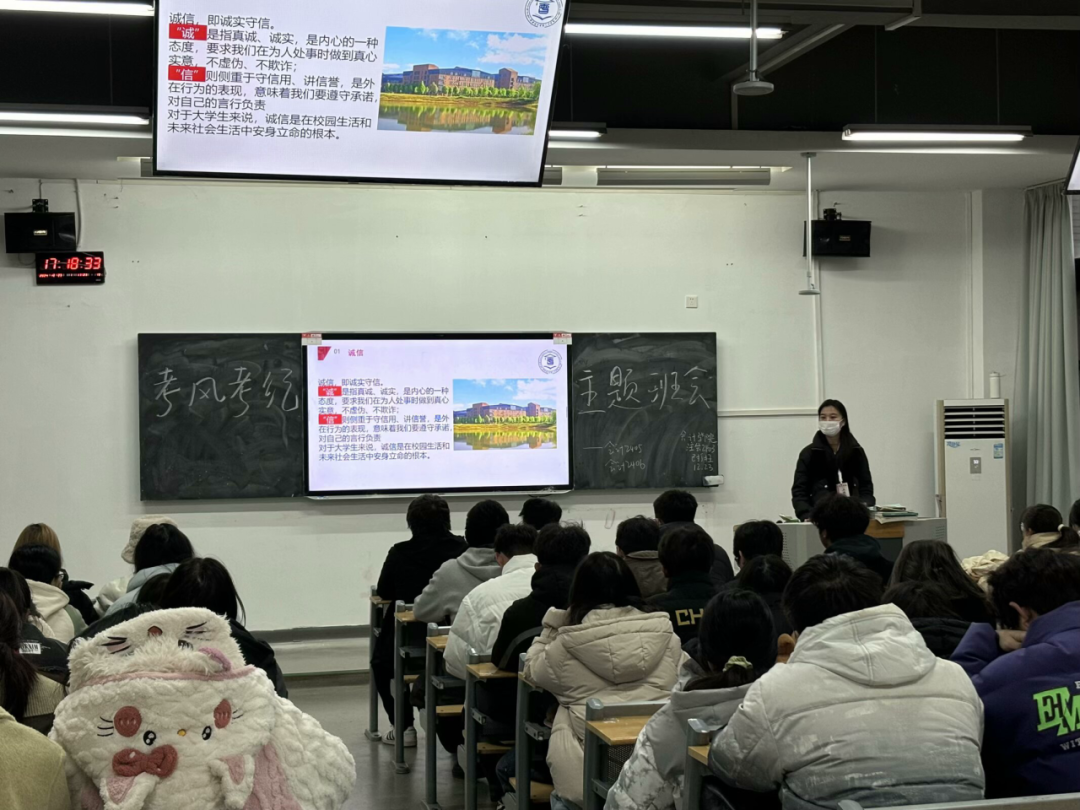 在主题班会上,班助们围绕“诚展风采,信见真章”这一主题,从多个方面展开讲解。首先,深入阐述了大学生诚信做人的基本素养,强调诚信是大学生在校园生活和未来社会中安身立命的根本,要求同学们在为人处事时秉持真诚、诚实的态度,做到守信用、讲信誉。随后,详细解读了学校的考试违纪处分决定文件,对挂科与重修的相关规定进行了说明,让同学们清楚了解考场纪律和违纪后果。