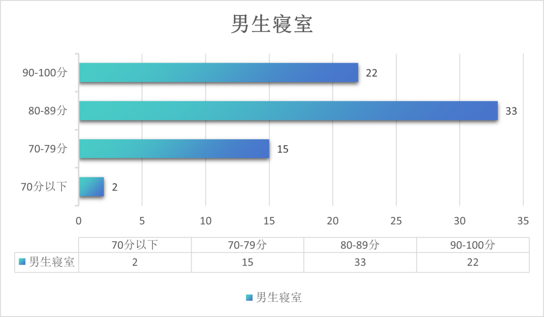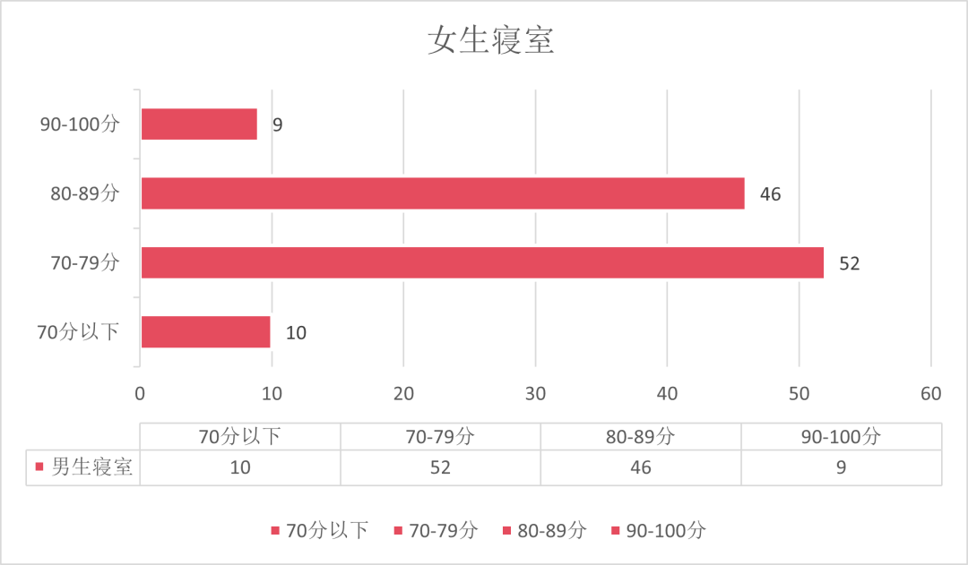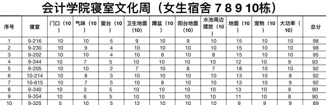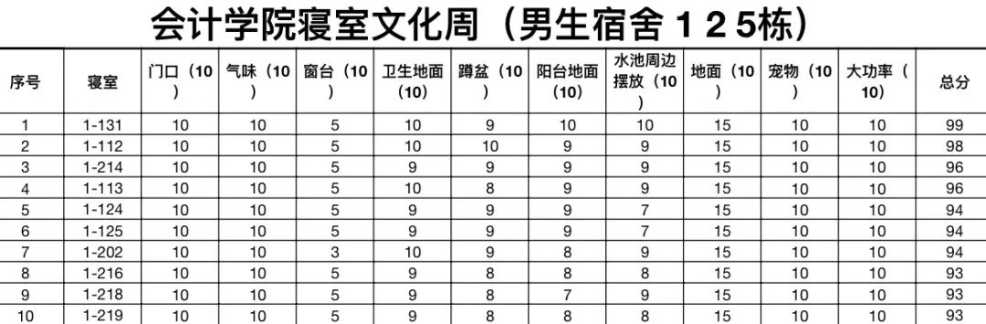 在此次寝室文化周工作中,共检查7栋楼,1栋(男寝)平均分82.75分,2栋(男寝)平均分79.16分,5栋(男寝)平均分84分,7栋(女寝)平均分73.33分,8栋(女寝)平均分76.16分,9栋(女寝)平均分76.99分,10栋(女寝)平均分82.22分,整体平均分78.97分,5栋取得最高分84分,寝室一共194个,其中女生寝室120个,男生寝室74个。以下是男女寝评分排名前十名的名单:
