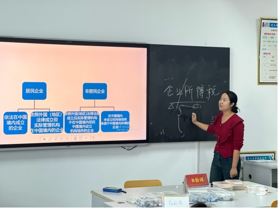 袁梦老师以习题的方式回顾了上节课知识点,并引入《企业所得税》全新章节的教学,从企业所得税的概念定义到计算方式,清晰的讲解了相关原理,并即时以习题的方式让学生了解整个知识点实际应用的情况。对于其教学方式以及内容,梅培老师和李玉洁老师建议课件可进行进一步改善、更加突出知识重难点,便于提高学生的注意力。另外,老师们也建议其并改进板书,增加上节课内容回顾的深度。