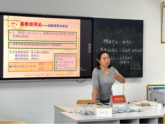 胡莲老师则根据《微观经济学》课程中非常重要的消费者行为理论内容讲解为例,展示了效用论的教学过程。其设计的教学过程完整,思政融入紧跟热点、十分自然,语言生动幽默,举例贴近日常生活便于学生理解,整体教学氛围严肃且活泼。梅培老师和李玉洁老师均对其整体教学设计表示了肯定,着重赞扬了胡莲老师图形与板书相结合的教学方法,整体知识框架重点清晰、逻辑明确,值得各位老师借鉴。