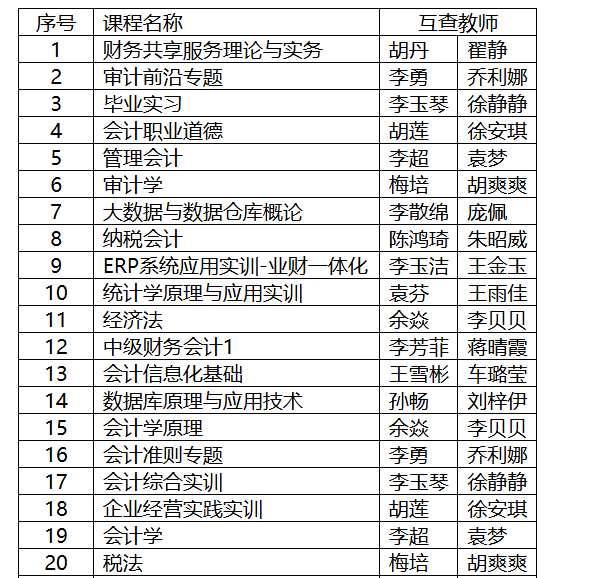 在本次自查工作中,我院总共有101门课程参与了自查,参与教师人数为69人;会计系共有35人参加了此项工作,自查课程数量为38门;财管系共22人参加了此项工作,自查课程数量为22门;工管系共有12人参加了此项工作,自查课程数量为41门。做到了全员参与,课程基本全面覆盖,最大程度提高本次专项检查的工作质量。