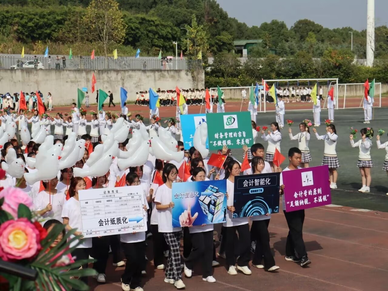 “会院青年,勇往直前”迎面走来的必赢电子游戏网站方队由三个专业的学生组成,他们个个步伐矫健,精神饱满。从传统走向信息化、智能化的跨越发展,会计人始终坚守初心和使命,“足额纳税,不漏税”是会计的原则,“不做假账,零差错”是财务管理的宗旨,“百年工程 零事故”是工程管理的目标。今天,他们将用汗水和热情,在运动场上展示会院新青年的力量与风采,友爱和温度。加油吧,运动健儿们!胜利,将与我们必赢电子游戏网站同在。
