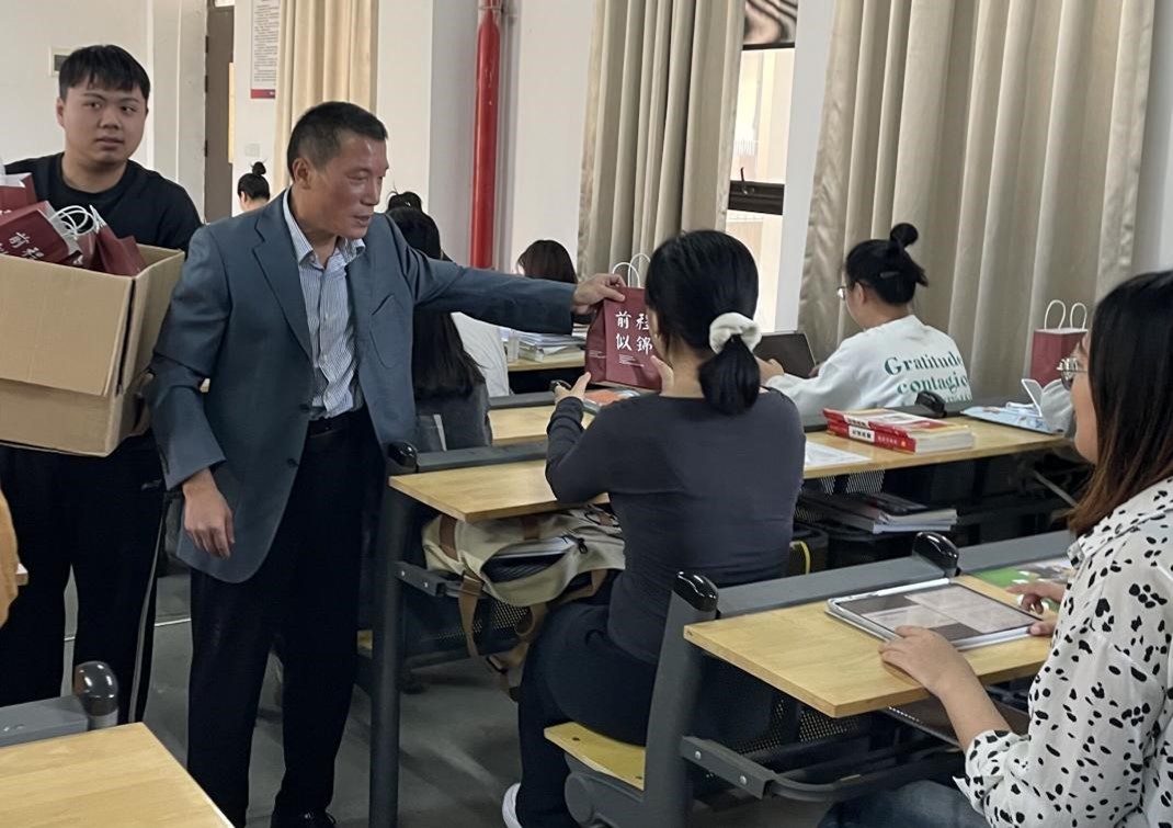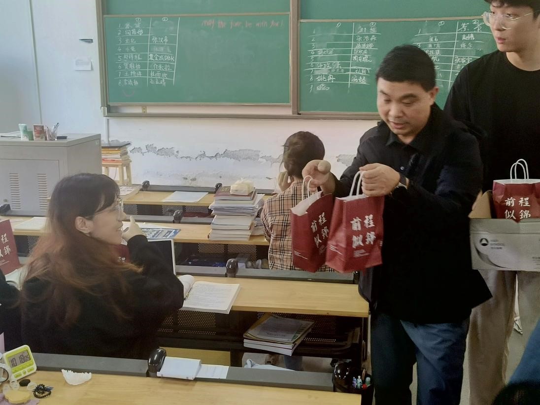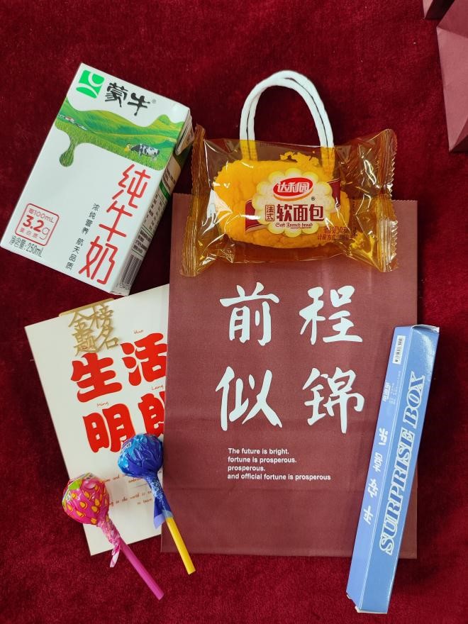 紧接着,老师们为考研同学发放精心准备的暖心小礼物。牛奶寄予“牛气冲天”之意,棒棒糖鼓励同学们在考研路上披荆斩棘,永远是“棒棒的”,贺卡和书签上写满对考研学子诚挚的祝福。