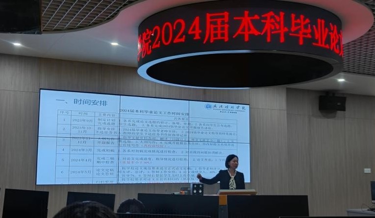 首先由教学副院长李勇老师传达了“武晴教务字〔2023〕67号关于2024届本科毕业论文(设计)工作安排”的文件精神,她对我院2024届本科毕业论文各阶段的工作安排及相关要求进行了详细的部署,严格按合格评估及学校文件要求开展毕业论文相关工作,如选题应符合专业培养目标的要求、严格执行由“教师-系-学科带头人-院长-导师学生讨论确定”的层层审核把关制、实践性选题大于50%等要求。坚持把行业、企业一线以及社会需要作为毕业设计选题主要来源,更加注重与社会、生产、科研和实验相结合,选题范围大小适中,难易适度,学生能应用自己掌握的知识、理论,针对某一具体现象或问题展开分析研究。选题不宜求大求全,应与学生知识储备与研究能力相匹配。