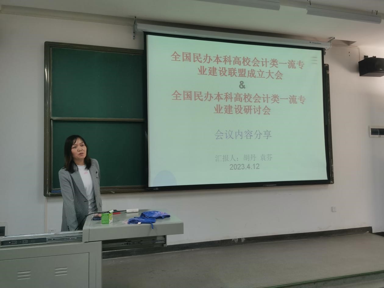 之后,会计系的胡丹老师分享了前往广东南方学院参加“全国民办本科高校会计类一流专业建设联盟成立大会&全国民办本科高校会计类一流专业建设研讨会”的体会。胡老师重点围绕三个方面介绍会议内容:(1)会计学人才的出路与会计学一流专业建设;(2)会计专业学生的时代思维与研究性学习视野;(3)会计学国一流建设:南方学院的实践。其中广东南方学院的会计学专业为国家一流专业建设点,其有关会计学专业人才培养的实践探索为我院会计学专业人才培养提供了一定的借鉴思路,同时胡老师表示将同全系教师一道努力把会计学专业建设成为国家一流专业。老师们很受鼓舞。一起参会的袁芬老师进行了关于深化产学研合作的分享,强调产学研合作的重要性,以及项目化教学的优势,强调我们要为国家培养行业需要的应用型人才。