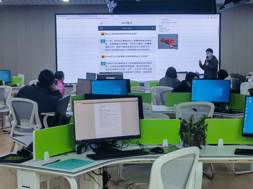 在接下来的培训过程中,老师们积极参与,在用友新道培训讲师的指导下,进行课堂讨论、分组实训、操作共享平台等。在培训期间,院长多次前往实验室培训现场观摩,鼓励指导大家。经过二天的培训,检验了实验室的功能设备,提升了老师们的专业水平,强化了学院教风,为新学期工作开了个好彩头。