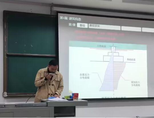 王凌锋老师主要讲授的是《房屋建筑学》课程中的第五章基础。他首先用了3分钟左右的时间对上节课的内容做了要点回顾,如构造柱的布置,构造柱的做法等;接下来通过一个工程实际案例阐述时政中的有关建筑基础工程安全的重要性,很自然地引入到本节课的主要讲解内容—基础。在讲解桩基础时沿用了一段2分钟左右的桩基施工工艺础视频并进行了讲解。王凌锋老师首先讲述了基础的定义以及基础的几种常用的类型,基础的埋深;再进一步对不同基础形式的适用情形做了详细的讲授。整个授课过程内容完整,并结合实际工程实例进行了具体分析,最后进行了小结。