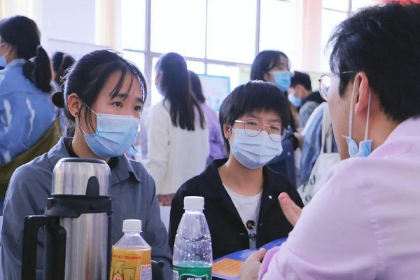 招聘会现场人来人往,毕业生们手里拿着简历,跃跃欲试,积极询问各企业招聘岗位的要求,给心仪的企业投上简历。各企业招聘人员热情地向求职者详细介绍相关要求与待遇。