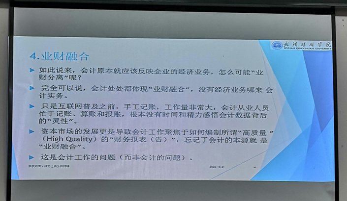 赵教授讲座的第二部分给我们讲述了财务转型,我们在现实财务工作中的困惑、财务转型的方向、基本要求、动因、途径以及转型中必须坚持的五个重要理念,还跟我们讲解了怎么在工作中运用“云雨伞理论”发现分析解决问题以及时间管理的法则。接下来教授给我们讲了业财融合还有商业模式,没有最好的商业模式,只有适宜的商业模式,这句话可谓是精辟独到。
