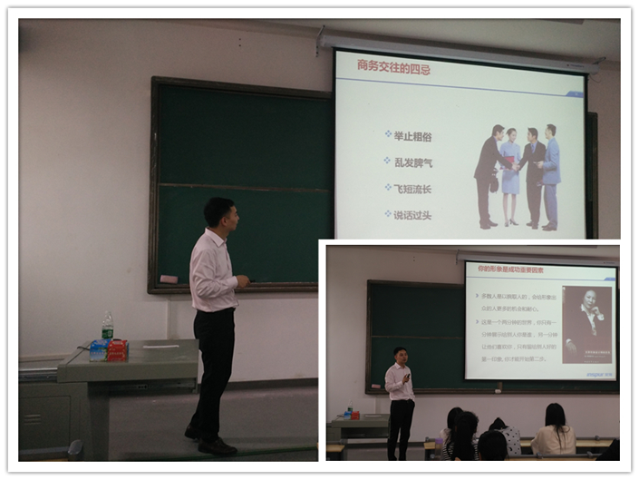 在短暂的休息过后导师从消费市场分析了客户和公司的密切联系,公司的市场部以及销售人员应该怎样和客户建立亲密关系,赢得客户的心。无论是面对客户,还是面对老板,形象礼仪十分重要。“这是一个两分钟的世界,你只有一分钟展示给别人你是谁,另一分钟让他们喜欢你,只有留给别人好的第一印象,你才能开始第二步。”这个有趣的开篇燃起了在场同学们的兴趣。这其中包含了会见应按照问候、介绍、握手、引导、交换名片的步奏,平视前方能表现出客观和理智,先人后己的礼貌态度,生活中入座的讲究,在不同场合中着装和时尚的结合等等,让同学们在欢声笑语中受益匪浅。