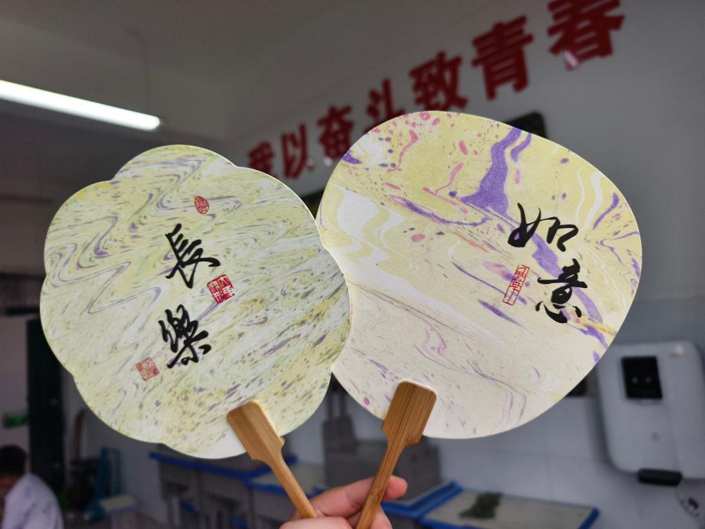 志愿者们将传统漆艺文化与趣味实践相结合,细致教学漆扇绘制的技法要点。调漆时的细腻搅拌、裱糊时的轻柔贴合、描金时的专注勾勒……每一道工序都考验着耐心与巧思。当彩漆在扇面上晕染开独一无二的纹路,一场关于传统与匠心的邂逅在教室悄然上演。
