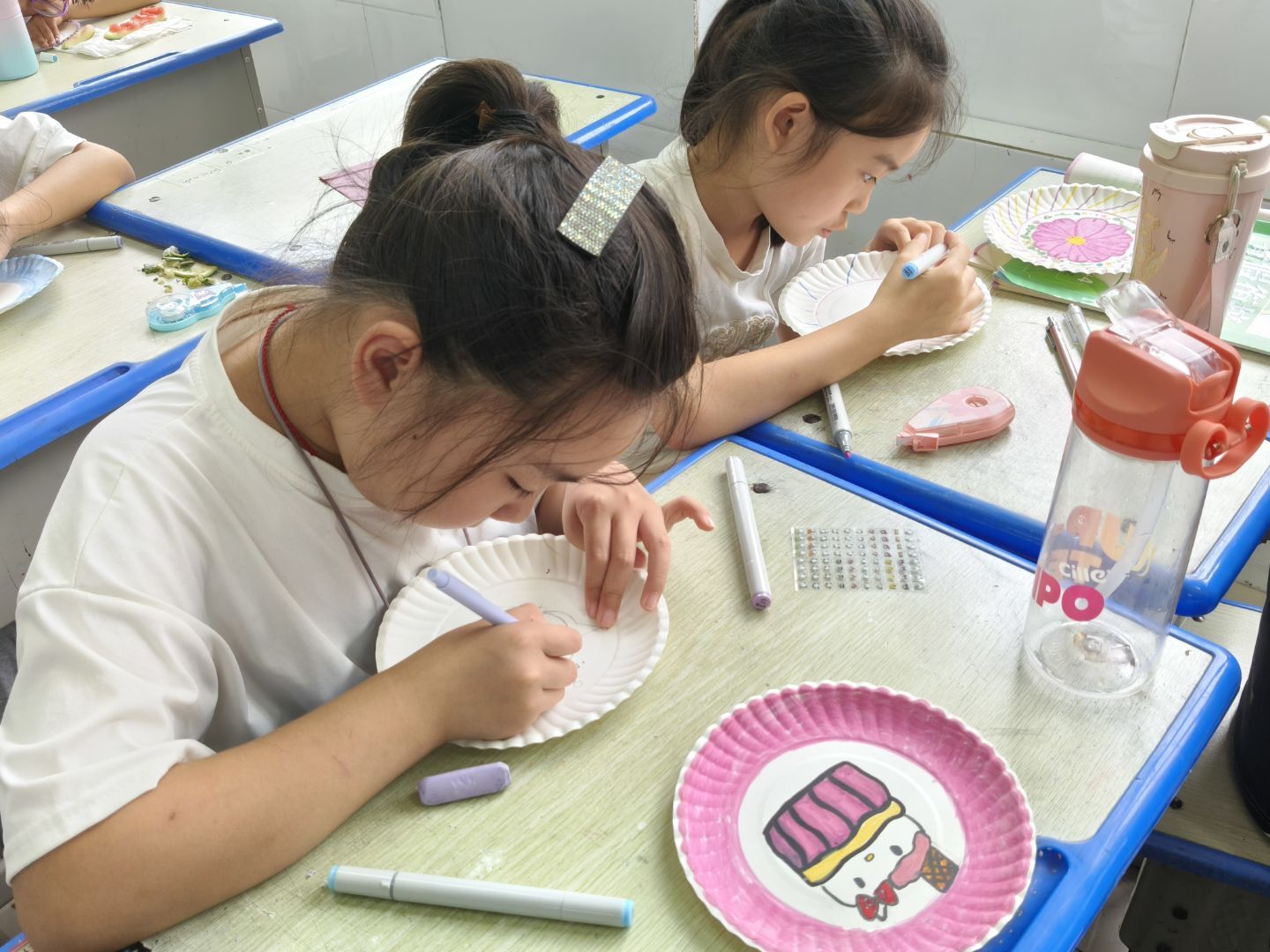 随后学生们拿起画笔动手创作,把校园里的大树、天上的云朵、动画里的卡通形象等,都化作盘子上灵动的图案。笔尖划过纸盘的沙沙声中,教室里的笑声与彩色颜料一同漾开,暖意融融。三十余件充满童趣的盘画作品在窗台上一字排开,每件作品都藏着孩子们的奇思妙想。那一刻,非遗不再是课本里遥远的名词,而是能捧在手心的快乐与美好。