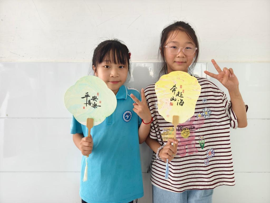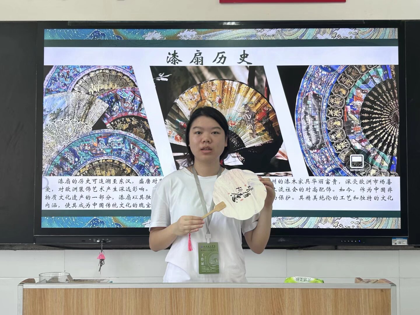志愿者郑娇娓娓讲述漆扇从东汉宫廷的雅致器物到欧洲上流社会的珍藏品的传奇历程。当“金榜题名”“顺风顺水”等寓意吉祥的传统纹样通过拓印技法呈现在扇面时,历史的厚重与童心的纯真悄然相遇,孩子们眼中闪烁着惊奇的光芒,意识到手中轻摇的折扇竟承载着如此深厚的人文记忆与文化底蕴。