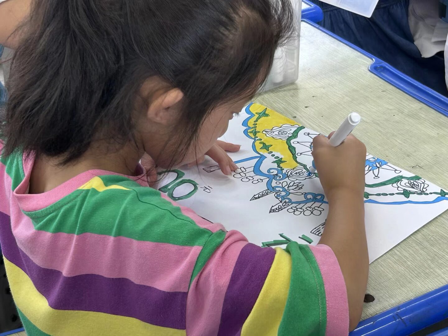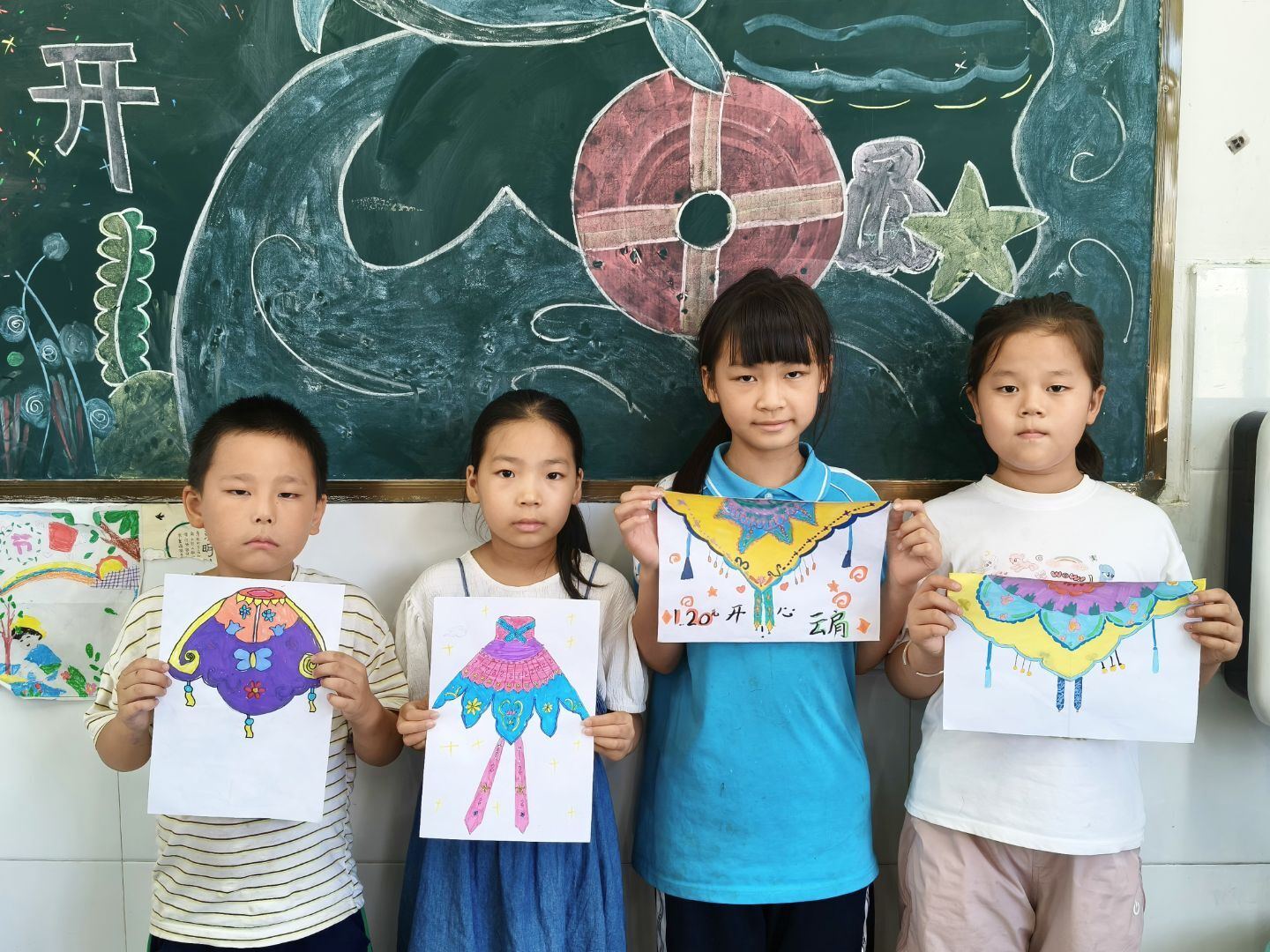 讲解完毕,孩子们迫不及待地拿起画笔,仿佛一群怀揣着梦想的小艺术家。瞧,那个孩子以传统花鸟纹样为蓝本,精心勾勒着每一片花瓣、每一根羽毛,仿佛能听到鸟儿的婉转啼鸣,看到花朵的娇艳绽放。一时间,教室里弥漫着艺术的气息,孩子们用画笔让云肩在纸上“活”了过来,古韵在笔尖肆意流淌。