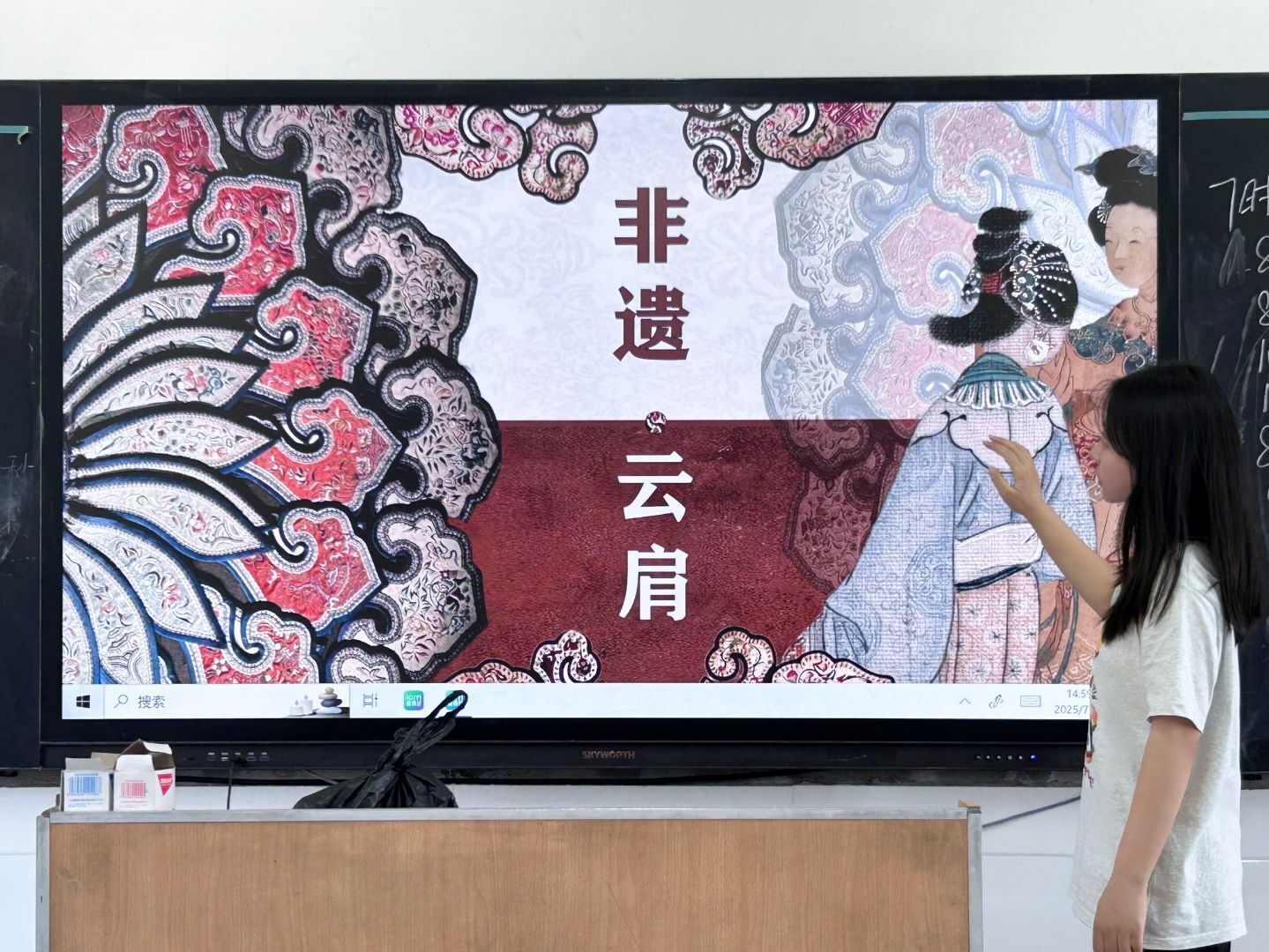 课堂上,志愿者杨思帆宛如一位穿越时空的文化使者,她轻启朱唇,娓娓道来云肩的故事。从云肩起源时那神秘的传说,到不同朝代样式如诗般的演变,再到刺绣工艺中针法那千变万化的精妙,每一个细节都如同夜空中闪烁的星辰,照亮了孩子们求知的眼睛。