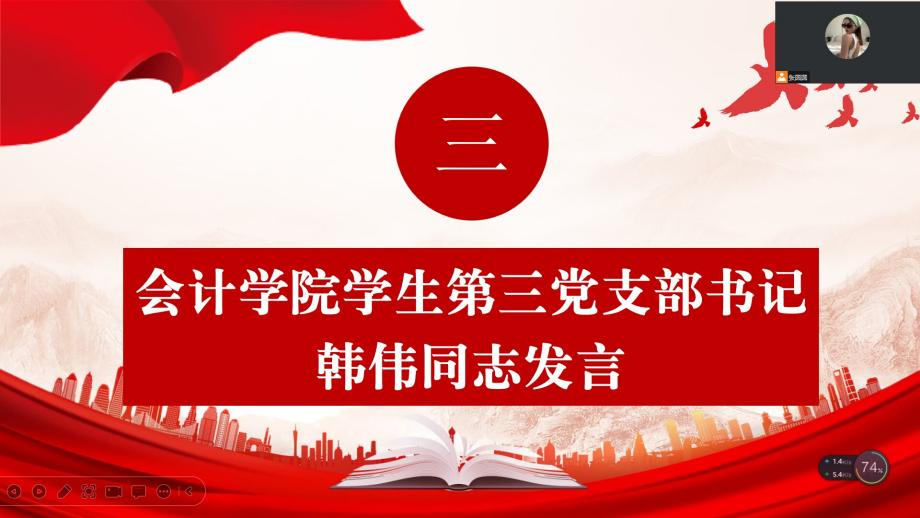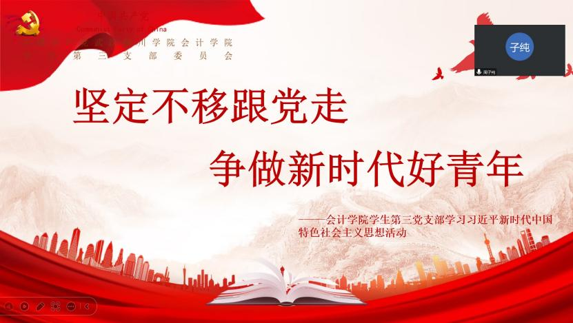 (指导老师:韩伟)为持续深入学习贯彻习近平新时代中国特色社会主义思想,让支部党员坚决用习近平新时代中国特色社会主义思想武装头脑,指导实践,弘扬敢闯敢试,埋头苦干的精神。必赢电子游戏网站学生第三党支部于8月8日15:00通过线上会议的方式开展了主题为“坚定不移跟党走,争做新时代好青年”的第四次学习习近平新时代中国特色社会主义思想专题活动,支部书记韩伟同志以及支部全体党员同志参加了本次活动。