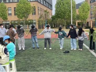由10人组成一队,手拉手通过上肢及下肢的配合,将呼啦圈依次穿过10名选手。这是一个团体项目,可以很好地增进同学们之间的友谊。同时辅导员们也参与了进来,与同学们一起手拉手将呼啦圈传递了起来,欢笑声也此起彼伏。