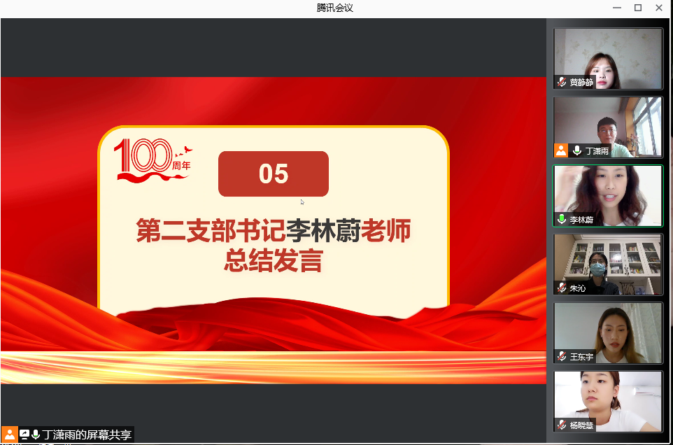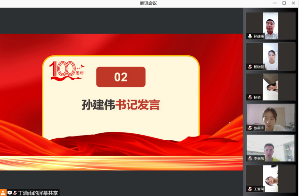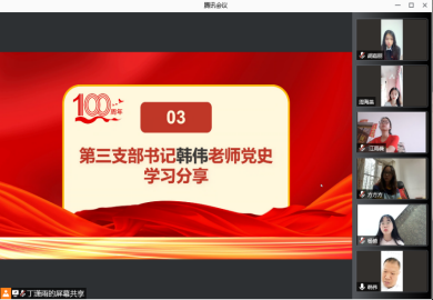 (通讯员:宋梦涵 摄影:黄静静)为热烈庆祝中国共产党成立100周年,学习总书记在“中国共产党成立100周年大会”上的重要讲话精神,2021年7月1日下午六点半,必赢电子游戏网站学生第三党支部组织开展了以“七一”建党百年为主题的线上会议。会议由学生党员丁潇雨主持,党总支书记孙建伟同志、学生各党支部书记以及全体学生党员参会。
