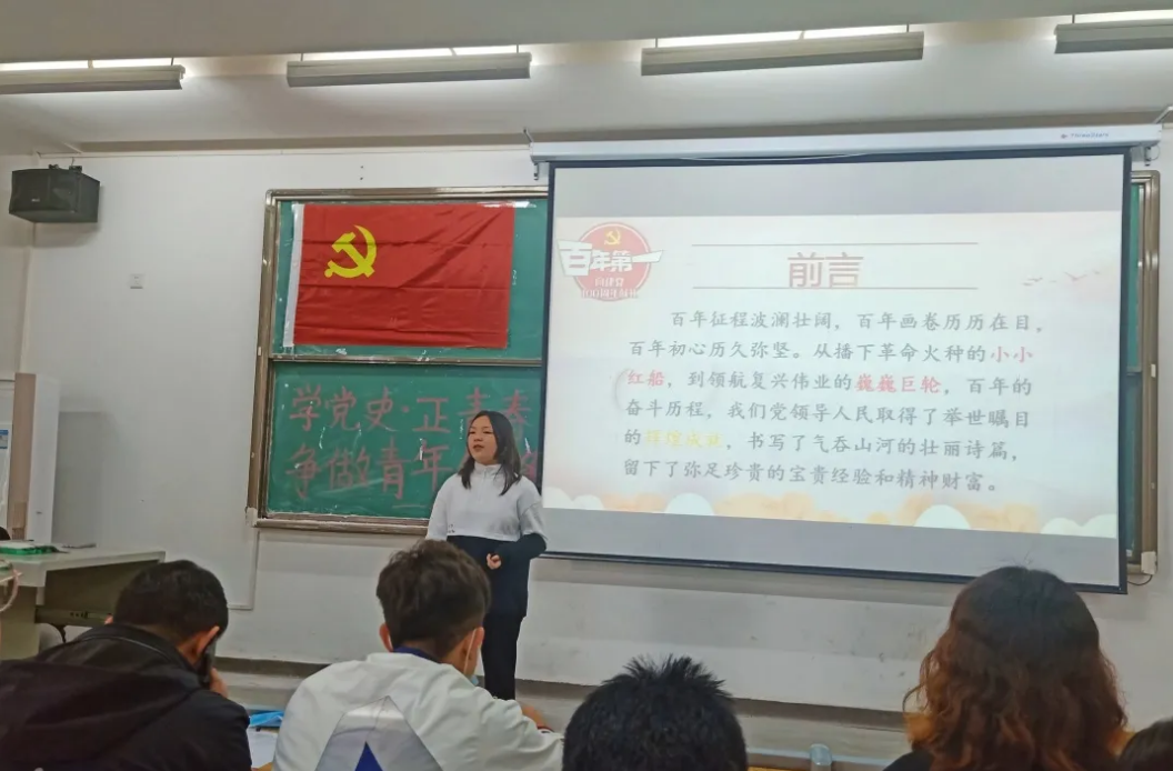 交流会在全体与会师生齐唱国歌中拉开帷幕。党总支书记孙建伟首先对学党史活动提出希望:第一,希望大家学习党的百年光辉历程中的历史故事,进一步坚定理想信念;第二,学习党的百年奋斗中的伟大精神,带动和影响青年永远跟党走;第三,发挥党员引领和带头作用,用行动向党组织靠拢,实现入党的誓言和初心。他还寄语同学们“奋斗新时代,青春正当时”。