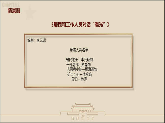 第二个环节是李元昭同学结合自身经历以及实际情况编写的,并有5个同学以连麦的方式表演的抗疫小短片,为同学们更加直观的介绍了各级防疫人员是如何让民众从不理解到大力支持疫情防控的小故事。同学们也真实体会到了工作人员的艰辛。疫情期间,社会各界全力支持国家的统筹安排,坚定打好疫情防控阻击战。幸得有这样的一群逆行者,他们用坚定的信念护得山河无恙,更幸得有像老王这样的居民,对于防控工作由不理解到理解到最后大力支持,战疫胜利号角的吹响才得以一次又一次提前。