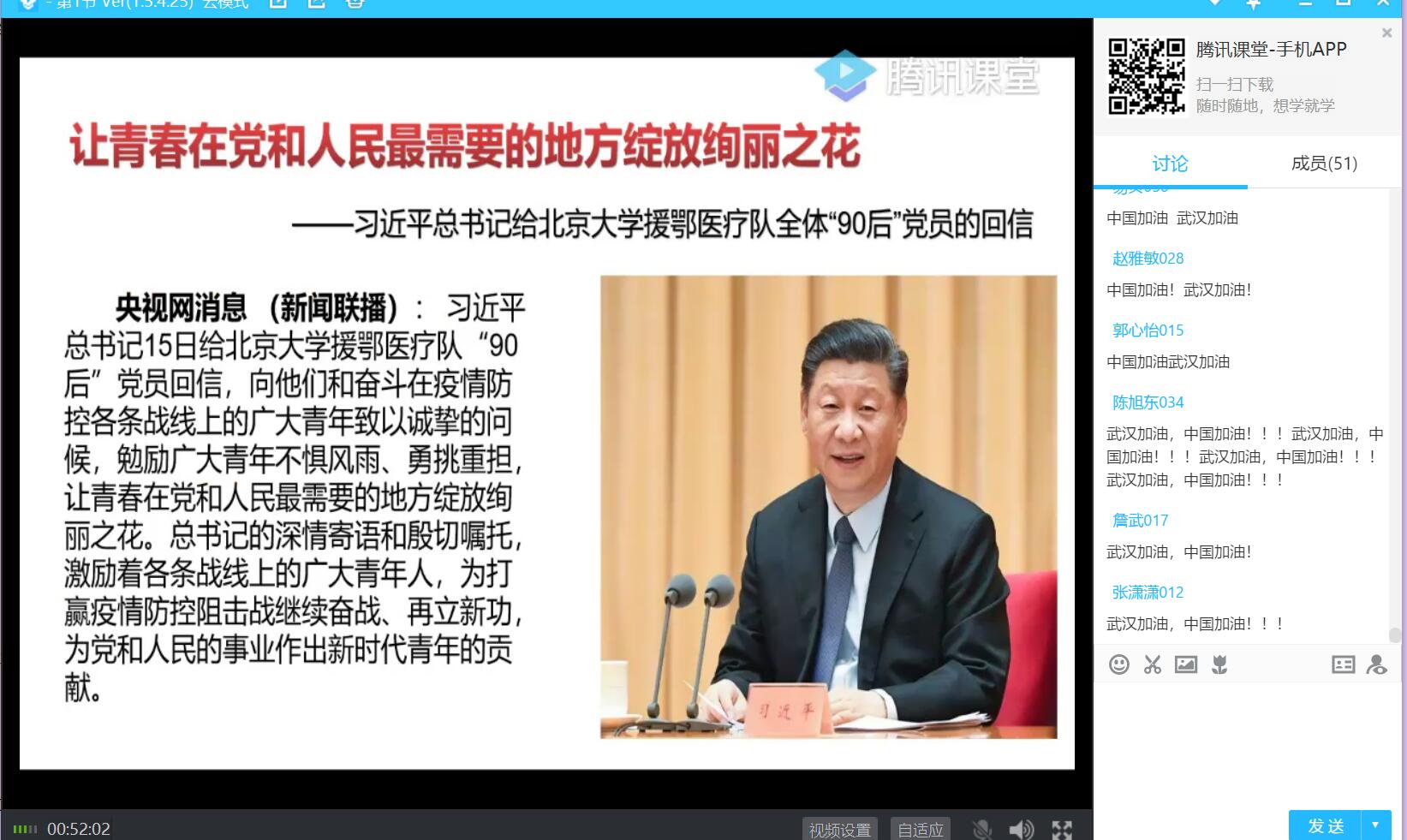 动。大家共同观看了习近平总书记给北京大学援鄂医疗队全体“90后”党员的回信。活动期间,全体同学积极参加,学习援鄂医疗队不畏艰险、冲锋在前的精神,立志为彰显了新时代中国青年的蓬勃力量尽一份力!