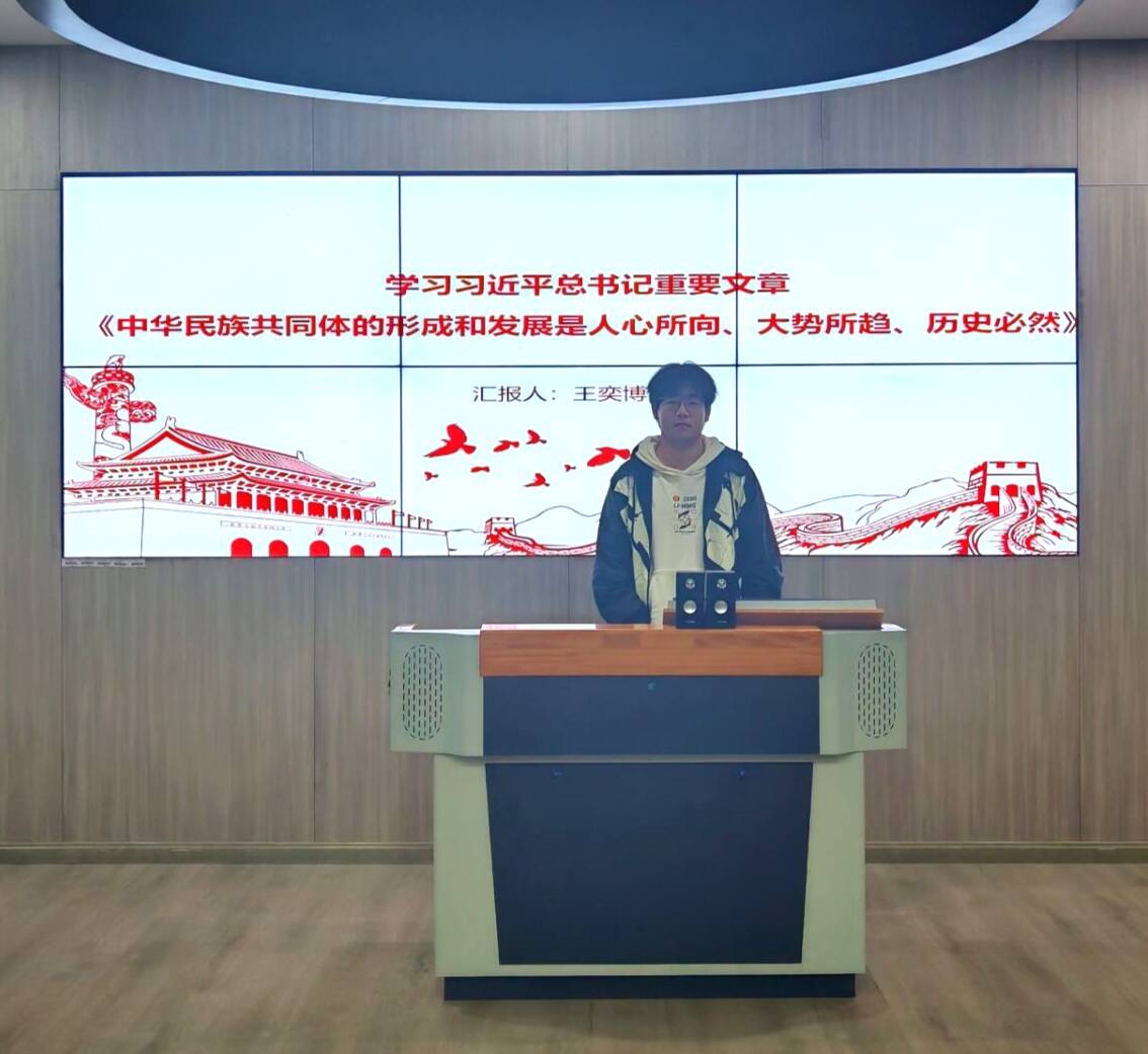 王奕博同志则围绕中华民族共同体的形成和发展进行了学习分享。他分享道,各民族血脉相融、信念相同、文化相通、经济相依、情感相亲是中华民族共同体的重要基础,其形成和发展是人心所向、大势所趋、历史必然。会议要求从这五个维度出发,深入开展民族团结进步教育,增强全体人员对中华民族的认同感和自豪感。