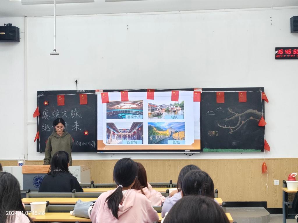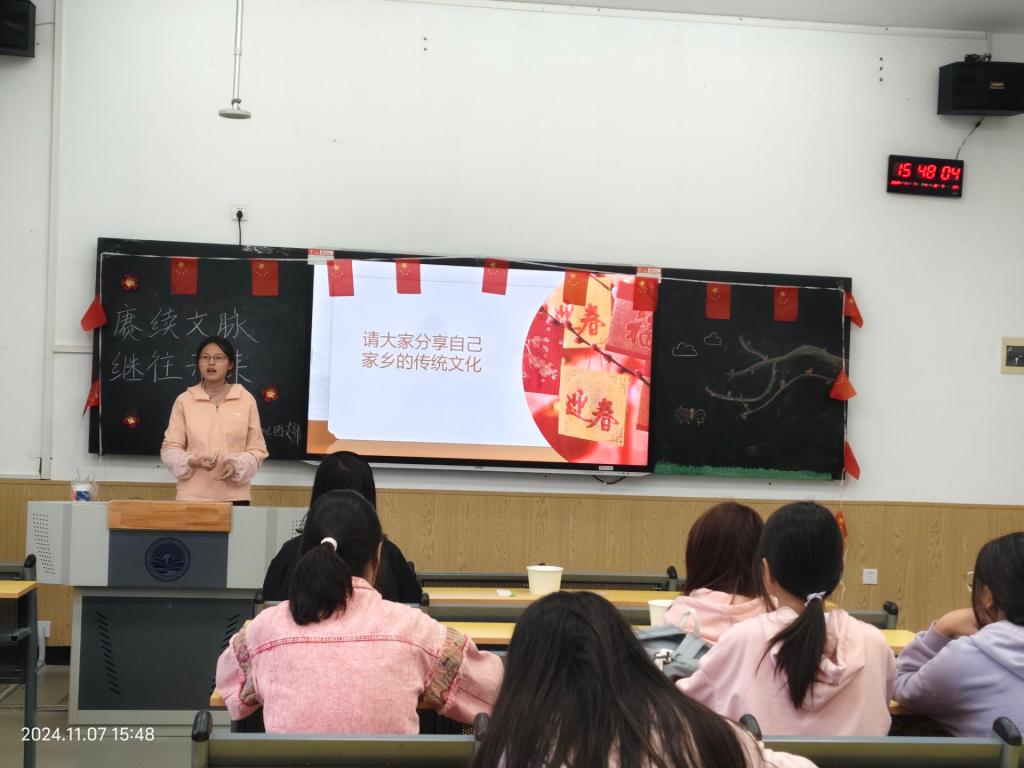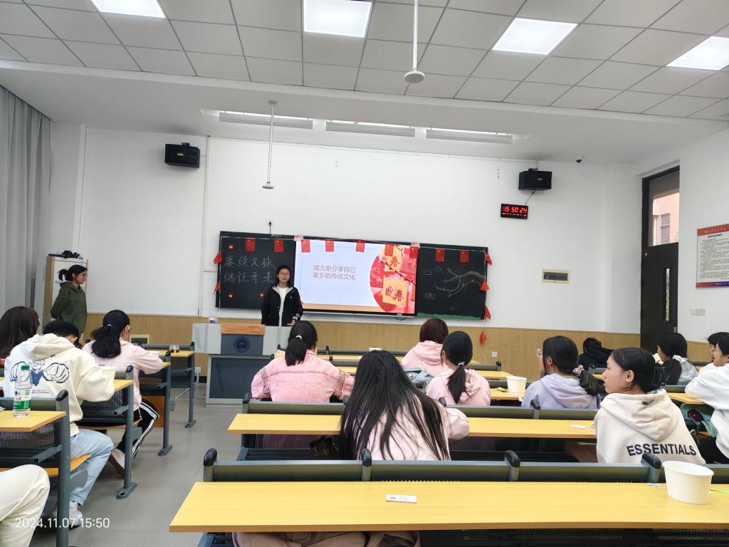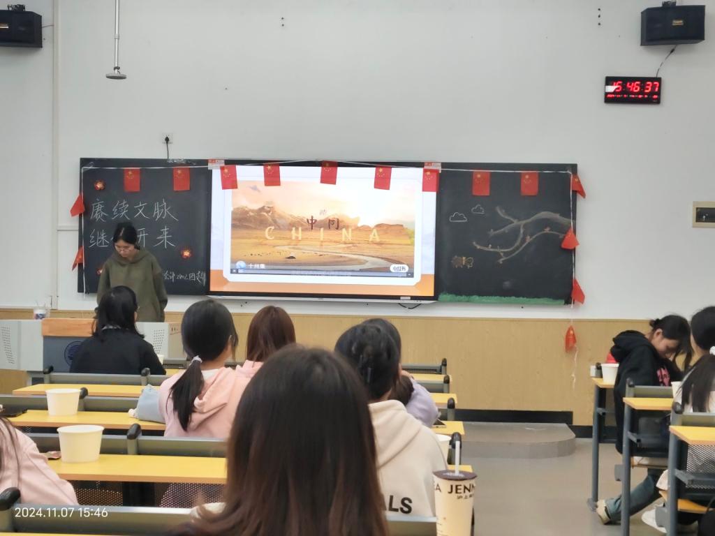 (通讯员:白思羽,辅导员:高梦瑶)为增强学生的民族自豪感和爱国情怀,培养积极的人生态度,树立正确价值观,提高个人的文化素养和思想品德,会计2402团支部特别策划以“扬传统文化之帆,颂千年华夏之蕴”为主题的团日活动,于2024年11月7日在教1-108召开。参加本次活动的成员为会计2402团支部全体,本次活动由胡维晗同学主持。