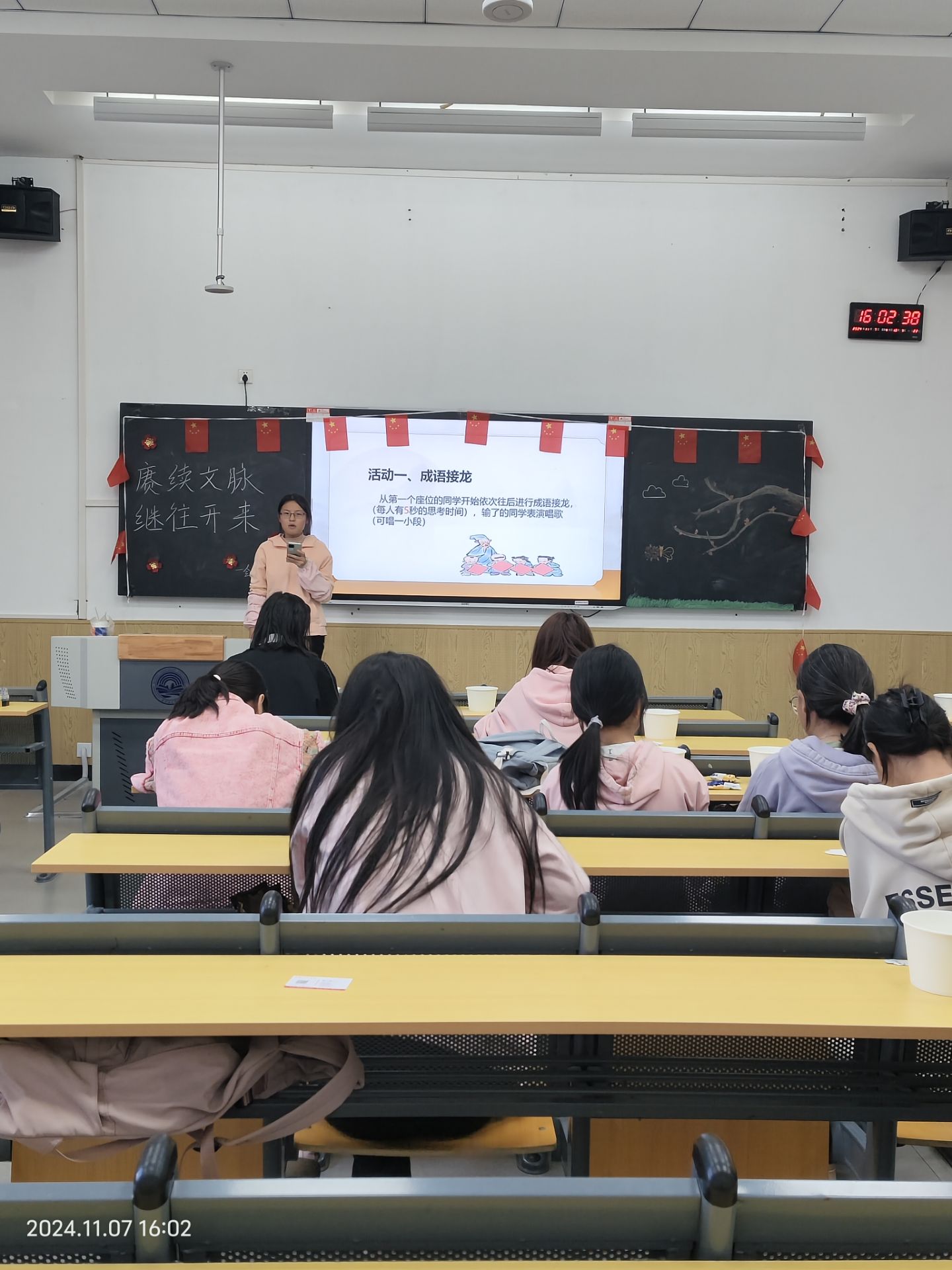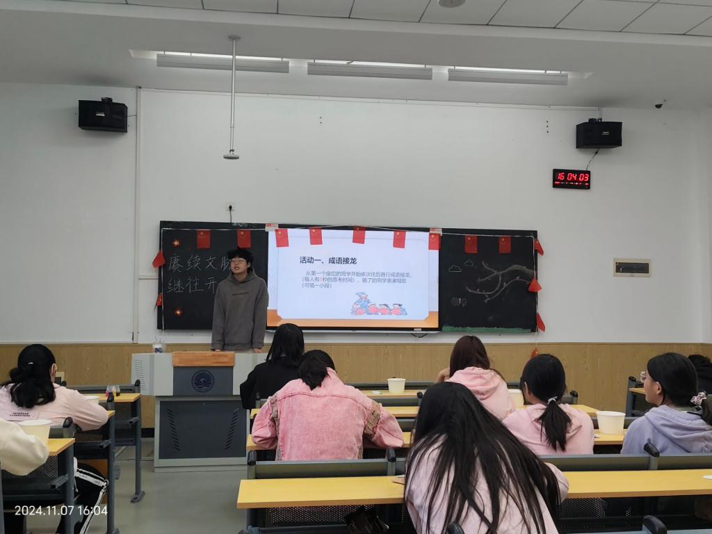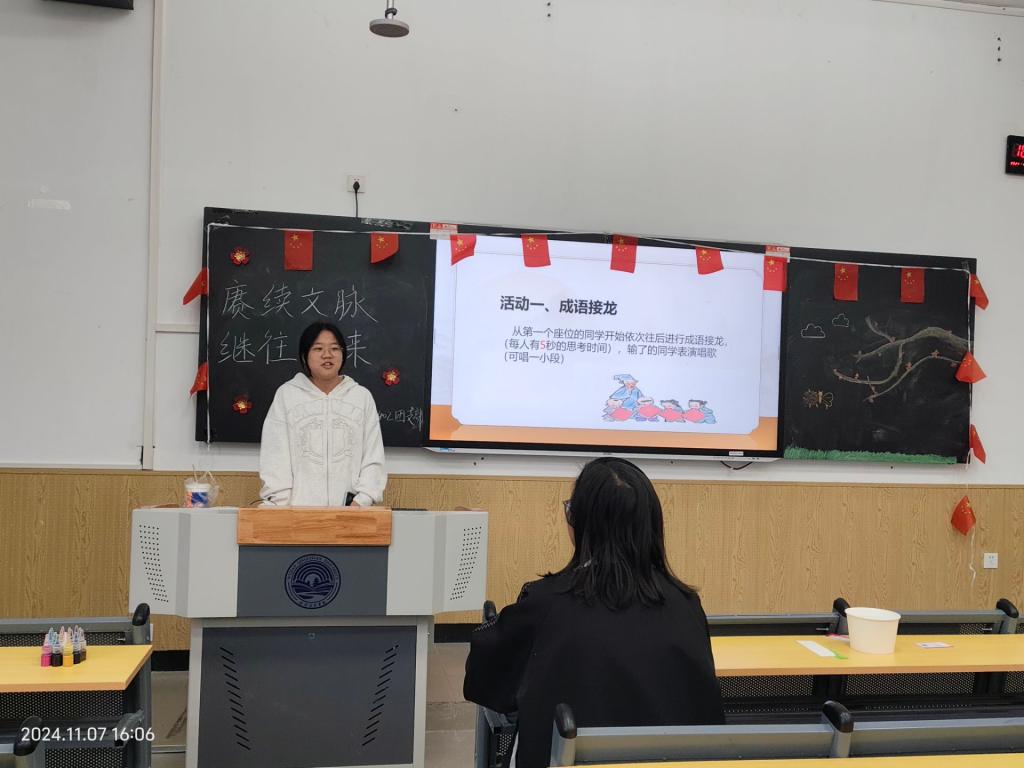 第三部分,组织文化活动,让成员们在轻松愉快的氛围中了解优秀传统文化。成语接龙活动通过富有知识性和趣味性的游戏形式,增强同学们对成语的理解和记忆,提高语言表达和逻辑思维能力,增进团队协作与交流,营造积极向上的学习氛围。三位同学虽然未回答上接龙,但各自介绍了自己家乡的文化,饶娉溪同学特意唱了与家乡有关的歌曲,获得同学们的欢迎。