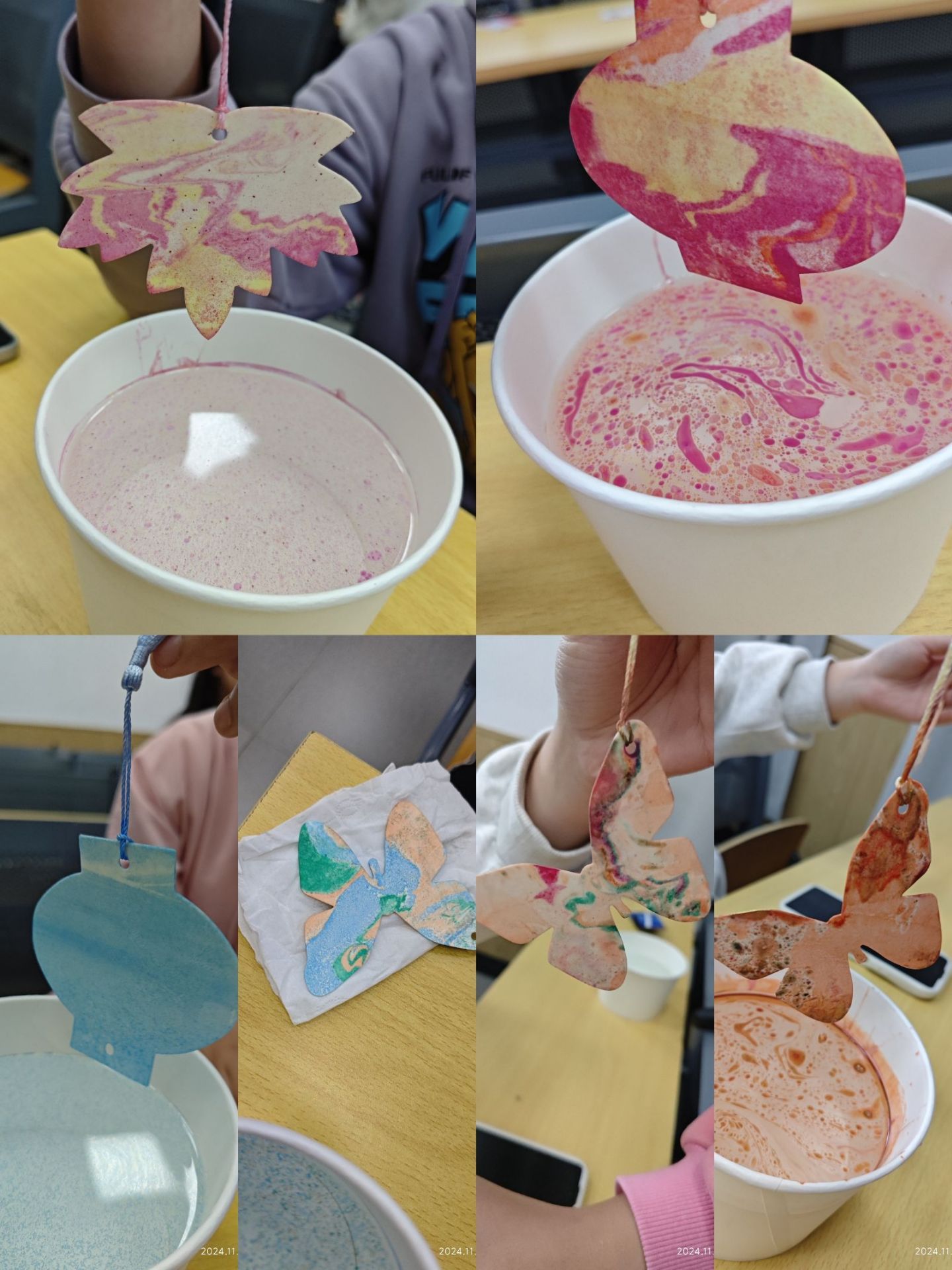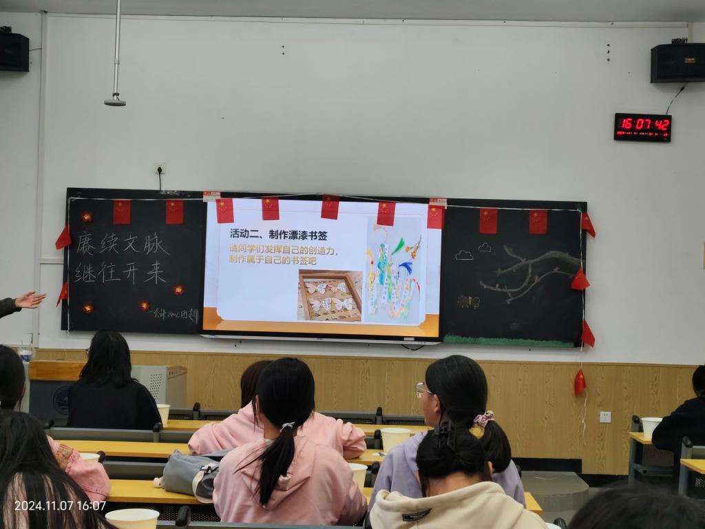第四部分,开展制作漂漆书签活动,漂漆是我国传统的一种古老手工艺术,它利用大漆不溶于水的特性,以点、甩、弹、划、等手法进行创作,是一项具有悠久历史和独特美的传统工艺。同学们跃跃欲试,纷纷加入到活动中,先将流苏栓在书签上,然后按照个人喜好调配好相应的颜料,随意滴在水面上用搅棒搅拌、打散。将空白的书签用不同的手法缓慢浸入颜料,动作轻柔缓慢但一定要连贯!缤纷缥缈的色彩跃然纸上。此次活动让同学们了解到中华文化的博大精深,了解了先辈们的智慧,认识到文化传承的重要性,从而对历史有更深的认识和尊重,筑牢精神之基,坚定文化自信。