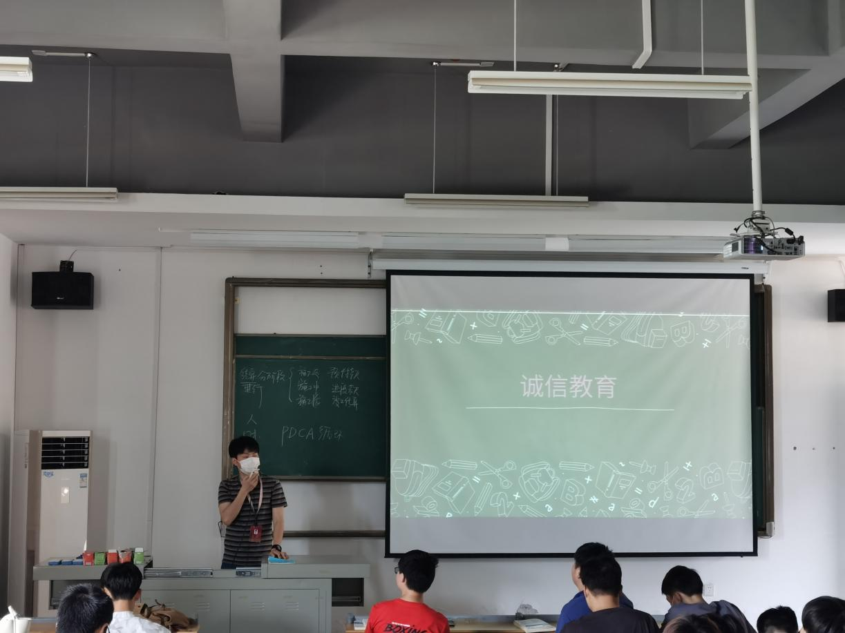 会上,韩老师先以何为诚信和不诚信切入,着重讲到诚信考试的重要性。他说到“诚信”组合起来就形成了一个内外兼备,具有丰富内涵的词汇,其基本含义是指诚信无欺,讲求信用。自古以来,诚信是中华民族几千年灿烂历史文化的重要组成部分。诚信被中华民族视为自身的行为规范和道德修养,形成具有丰富内涵的诚信观。对于学生来说,不完成作业、考试作弊、抄袭别人作业甚至不听老师的教导在宿舍使用大功率电器等行为都算是不诚信的行为。