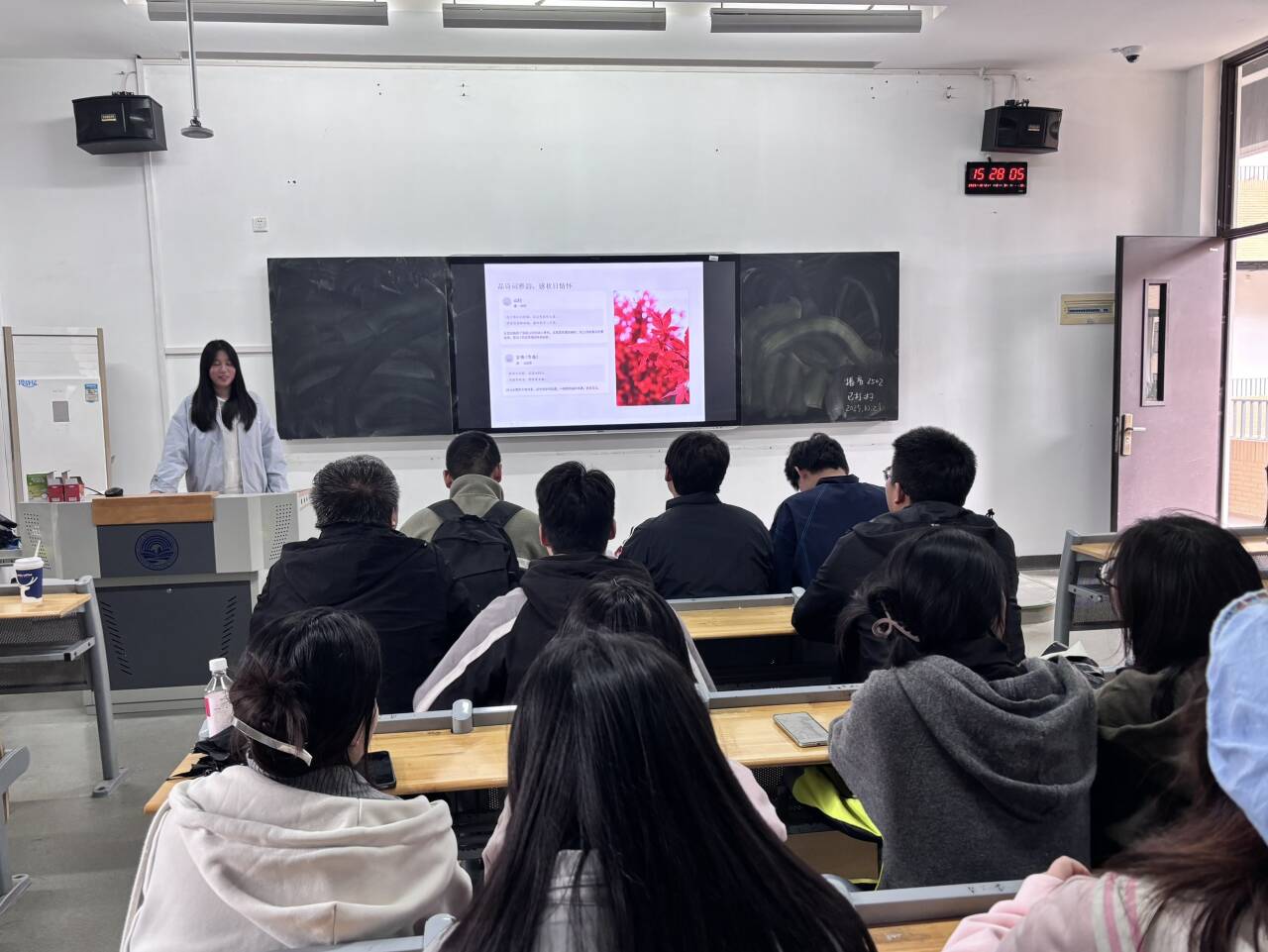 活动伊始,团支书朱滨彬走上讲台开启 “识・霜降” 环节。她通过 PPT 展示,介绍霜降是秋季最后一个节气,时间为公历 10 月 23 日或 24 日,太阳达黄经 210°,天气转冷露结为霜,南北气候呈现深秋与 “秋燥” 差异。